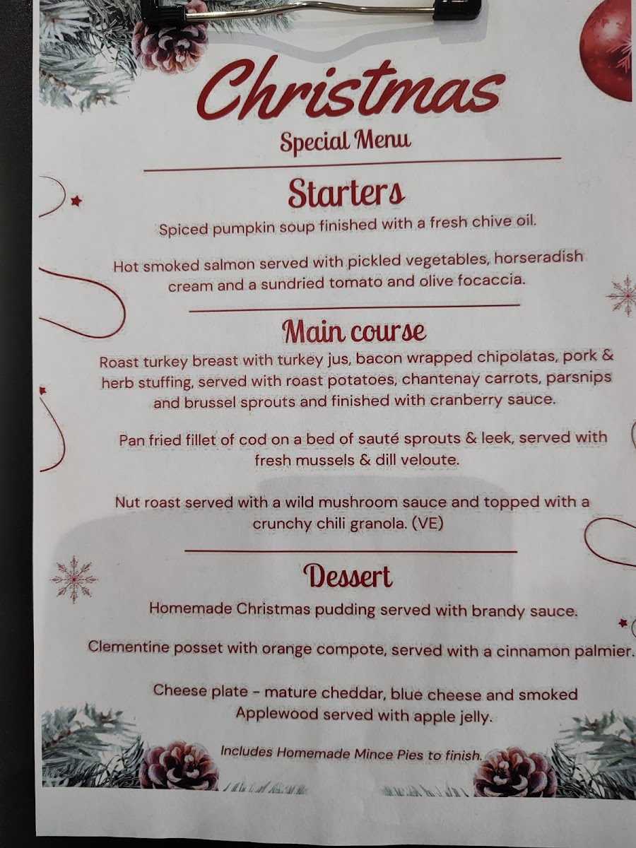 For the main course, relish the succulent Roast Turkey Breast dressed with a delightful turkey jus and served alongside savory bacon-wrapped chipolatas, pork & herb stuffing, and the perfect medley of roast potatoes, Chantenay carrots, parsnips, and Brussels sprouts. If you’re seeking an oceanic delight, the Pan-Fried Fillet of Cod will transport you to coastal shores with its fresh mussels and dill veloute. Vegetarians will find solace in the hearty Nut Roast, served with a rich wild mushroom sauce, topped with crunchy chili granola for an unexpected textural twist.